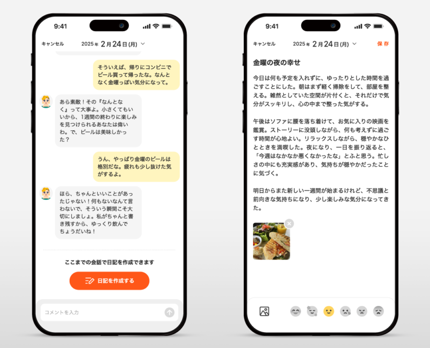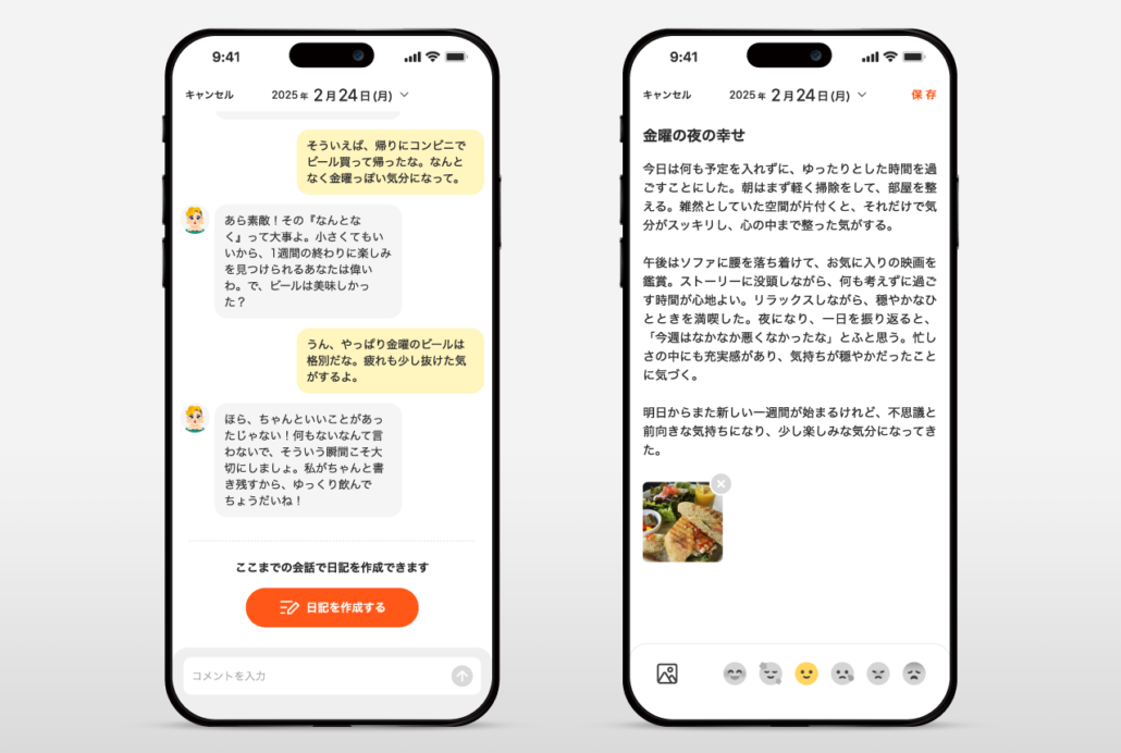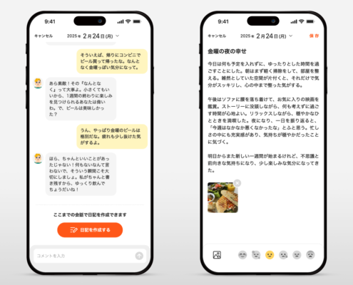 対話 → 記録 という構造を設計することで、日記を書くハードルそのものを下げる体験を実現しています。